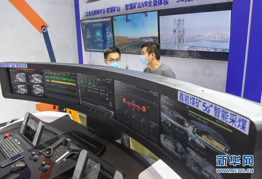 在武汉中国光谷科技会展中心举行的2020中国5G+工业互联网大会上,参观者了解一套5G智能采煤系统(2020年11月19日摄)。新华社记者 程敏 摄