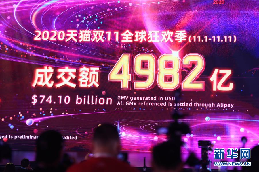在浙江杭州未来科技城学术交流中心,大屏幕显示阿里巴巴旗下天猫“双11”成交额超过4982亿元(2020年11月12日摄)。新华社记者 黄宗治 摄