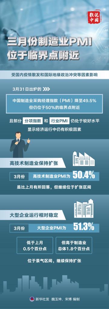 新华社北京3月31日电 受国内疫情散发和国际地缘政治冲突等因素影响,31日出炉的中国制造业采购经理指数(PMI)降至49.5%,但仍位于50%的临界点附近,且部分分项指数和行业PMI仍处于较好水平,显示经济运行中仍有积极因素。